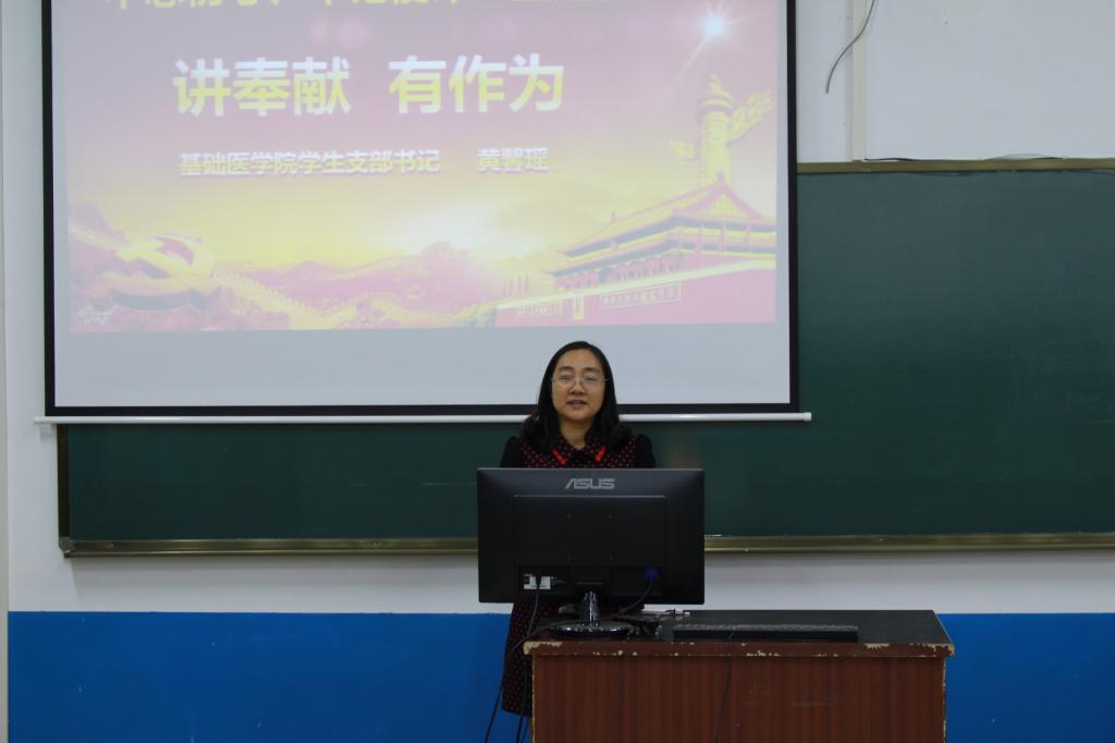 10月18日晚,医学院学生党支部书记黄馨瑶在西苑医学实验中心215教室以“讲奉献 有作为”为题讲授“不忘初心,牢记使命”主题教育专题党课,全体学生党支部党员参加了学习活动。