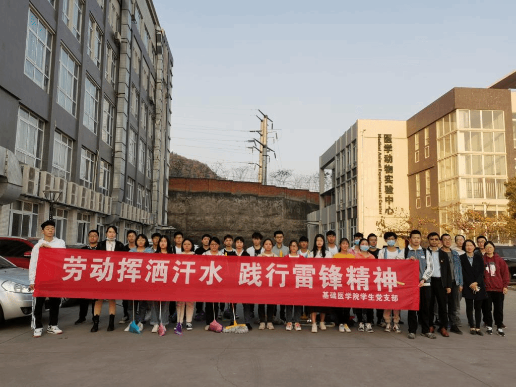 上午8点,基础医学院党委书记李东及部分教师党员带领学生支部党员和入党积极分子积极参加志愿服务活动——打扫医学实验大楼和医学动物实验中心。此次活动既是学雷锋活动的生动实践,党员志愿服务的具体行动。每位党员都拿着清扫工具,仔细认真地擦窗、扫地、拖地,把每个教室、角落都打扫得一尘不染。本支部成员在此次活动中不仅弘扬、践行了雷锋精神和劳动精神,还把自律攀医人作为自己的行动指南,牢记自己的党员身份,把为人民服务做到实处。