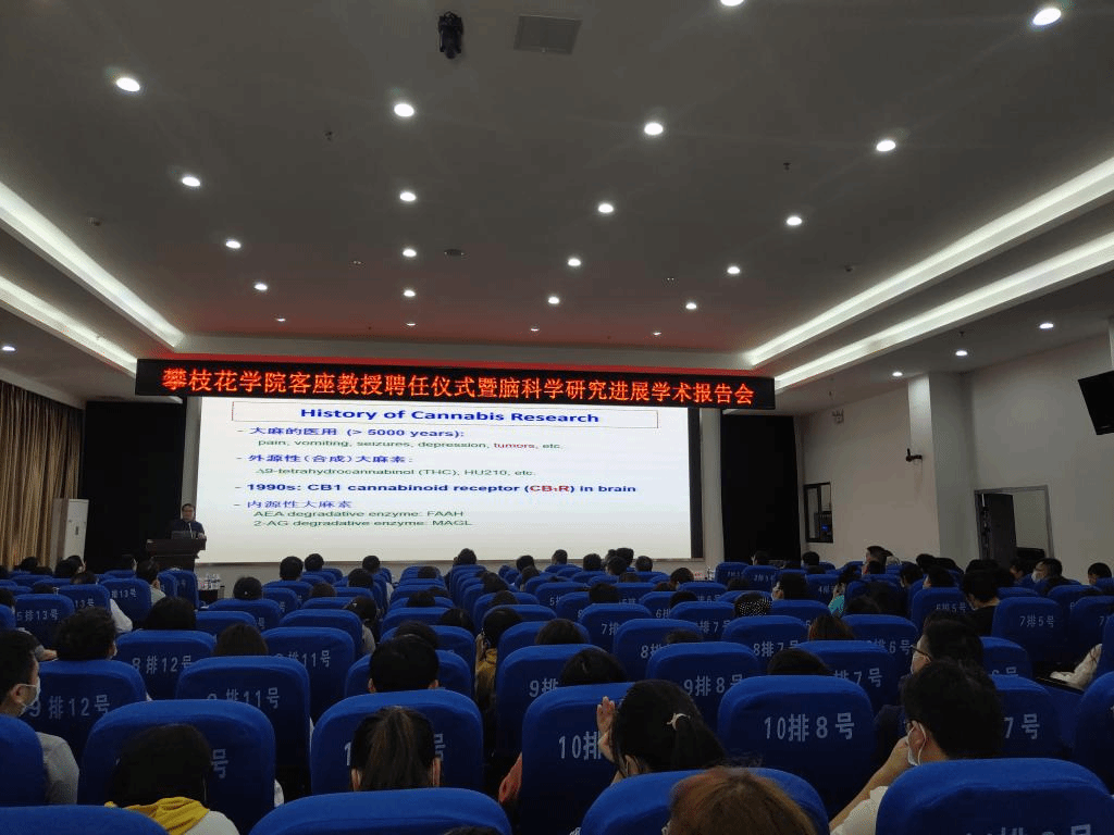 第一位讲者张遐教授,从攀枝花市大河中学走出的走向国际的卓越人才,师从第四军医大学鞠躬院士,1999-2019先后在加拿大莎斯卡彻温大学和渥太华大学任教,现任青岛大学脑科学与疾病研究院执行院长。近20年来,他率领的团队对大麻素调控脑功能与疾病的机理进行了系统和深入研究,主要研究成果发表在《细胞》(被选为2012年最佳12篇细胞研究论文之一)、《自然医学》等等。张遐博士也因这些突破性发现获得加拿大杰岀青年科学家基金 (2003-2008)、加拿大神经精神药理创新奖(2013)、美国国家精神分裂症和抑郁病研究联合会独立研究员基金(2007-2009)>中国教育部长江学者讲座教授(2007-至今)和中组部千人计划专家讲座教授(2017-至今),是中国人民解放军空军的第一个千人计划讲座教授。