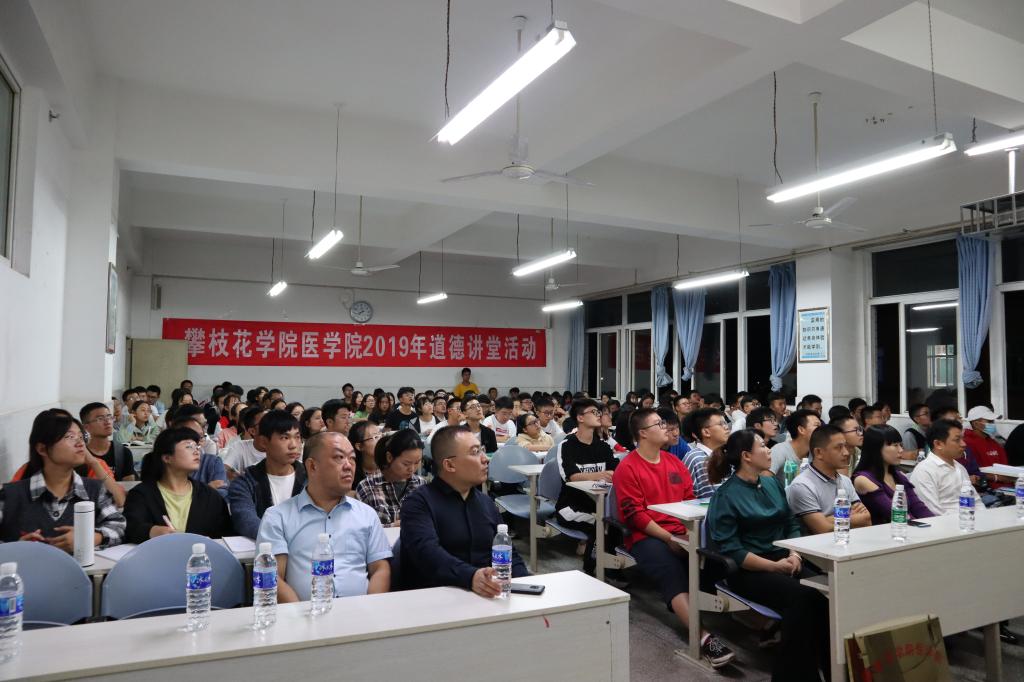 本次活动邀请了我校校友——攀枝花市东区银江镇卫生院党支部书记、院长胡太卫为同学们做专题讲座。胡太卫以“守初心 记使命 勇担当——做一名新时代合格的白衣天使”为题,为同学们讲述了一名基层医生的初心和使命,讲解了基层医疗卫生单位对人才的需求及目前基层医疗发展现状和存在的机遇,并结合个人成长经历,勉励同学们用科学的方法学好医学专业知识,掌握精准的专业技能,努力培养高尚医德和仁爱之心,立志为民族复兴大业,为服务人民群众健康贡献力量。随后,医学院党委书记张勤对本场“道德讲堂”活动进行点评。