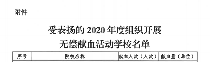 近日,四川省卫生健康委员会、省教育厅印发了《关于对2020年度学校组织开展无偿献血活动通报表扬的通知》,对2020年度在无偿献血工作中表现优异、成绩突出的98所学校予以表扬,其中攀枝花学院获得四川省无偿献血活动通报表扬。