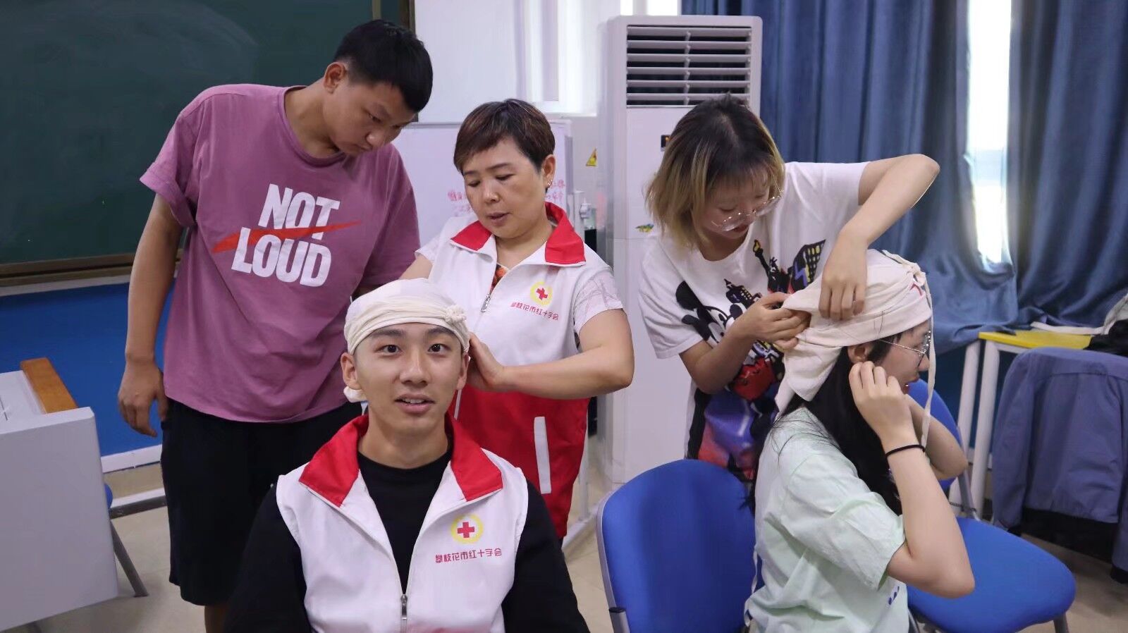 培训伊始,万老师分别从创伤救护概述,创伤出血与止血,现场包扎技术,关节脱位与扭伤,特殊创伤处置等方面详细向同学们详细讲解创伤救护知识。同学们经过理论学习,纷纷投入实践操作中去反复练习。培训现场井然有序,练习效果大大提高。
