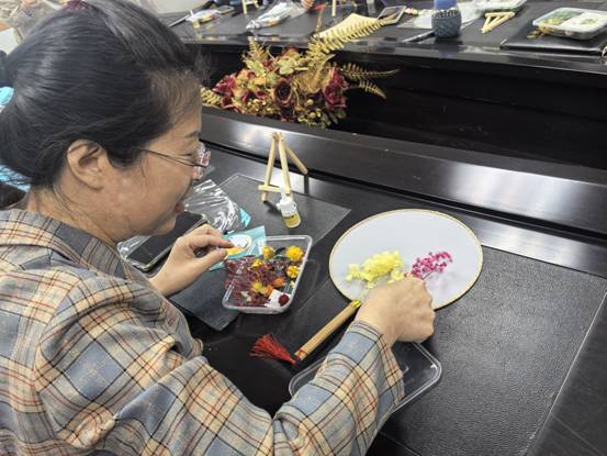 活动现场,素色团扇、永生干花、胶水镊子等材料整齐摆放,空气中弥漫着淡淡花香。活动由学院分工会主席李汇明老师主持和指导,她首先讲解了团扇作为“东方雅韵”的文化内涵,并示范干花配色、粘贴技巧。女教师们充分发挥艺术创造力,纷纷化身“巧匠”,以扇为纸、以花为墨,将彩菊、绣球、满天星等花材精心搭配,或疏密有致,或清新淡雅,原本素白的团扇逐渐被赋予灵动生机。