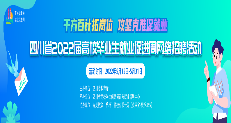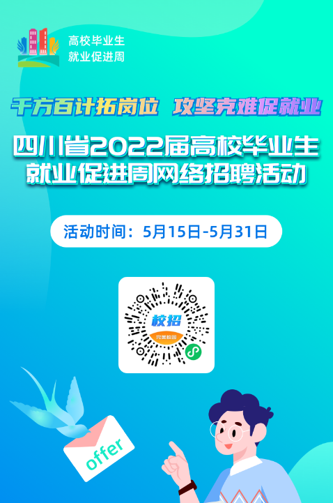 为深入贯彻落实党中央、国务院“稳就业”“保就业”决策部署,扎实开展四川省2022届高校毕业生就业促进周活动,多措并举搭建高校毕业生供需对接平台,助力毕业生更加充分更高质量就业,经研究,定于2022年5月下旬举办四川省2022届高校毕业生就业促进周网络招聘活动。现将有关事项通知如下。