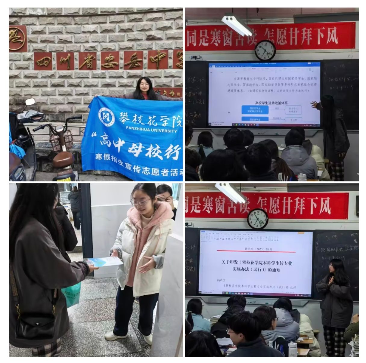 为扩大学校影响力,吸引优质生源,寒假期间,攀枝花学院基础医学院组织学生志愿者开展“高中母校行”招生宣传志愿行动。本次活动由学生自行组队,共组建16支宣传队伍,分赴安岳中学、绵阳外国语学校、绵阳中学实验学校及内江、彭州等地的多所高中,开展形式多样的招生宣传活动。